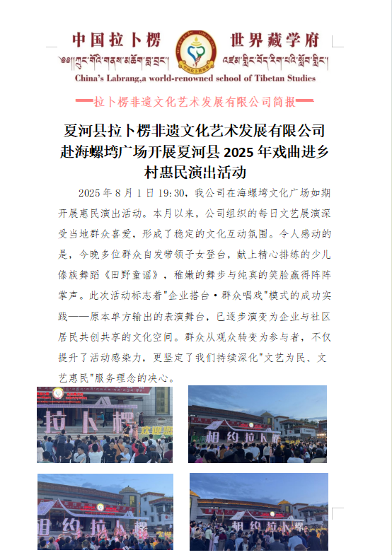 2025年8月1日19:30,我公司在海螺塆文化广场如期开展惠民演出活动。本月以来,公司组织的每日文艺展演深受当地群众喜爱,形成了稳定的文化互动氛围。
